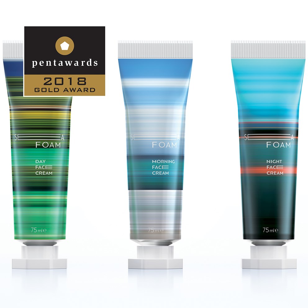 Также золотая награда у выпускников программы «Визуальные коммуникации» Британской высшей школы дизайна Татьяны Фарба, Александра Киржбаум за проект . Это концепт упаковки серии кремов для лица. Отдых на море, прекрасные пейзажи и слоган «Растяни мгновение счастья!» легли в основу. Растягивая утренний, дневной и вечерний морской пейзаж, дизайнеры создали «Sea Foam».