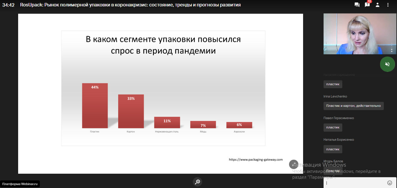 «Тренды мирового рынка полимерной упаковки 2020. Какие коррективы внес COVID» — тема выступления первого спикера вебинара Веры Бокаревой. Спикер обратила внимание, что в нынешней ситуации ушел негатив к полимерной упаковке. Общее мнение, что упаковка должна быть перерабатываемая, сохраняется, однако использование одноразовой упаковки, в частности полимерных пакетов, сейчас необходимо для соблюдения требований безопасности. Прогноз спикера - полимерная упаковка будет прирастать примерно на пять процентов в ближайшие годы, хотя докризисные цифры были меньше. «Это связано с тем, что растет спрос на повседневные товары, больше фасуется фармацевтика, очень активно развивается интернет-торговля».