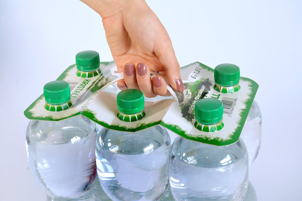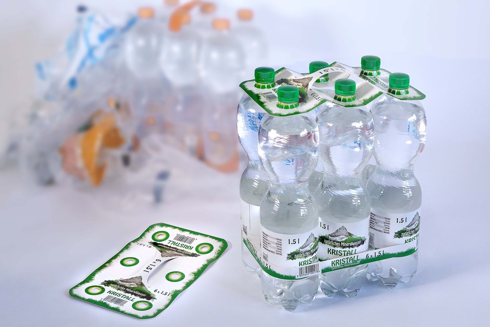 Between 1.5 and 2 billion returnable PET beverage bottles are still being sold each year in Germany alone despite the agreed upon targets for banning the use of single-use plastic products. 2 litre, 1.5 litre and 0.5 litre PET bottles are, and will continue to be, the most popular form of packaging in the beverage segment. As retailers find these disposable plastic bottles easier to manage than glass, i.e. returnable bottles, the number used is set to remain high in coming years. This makes it all the more important to avoid every single gram of extra plastic, i.e. secondary packaging, around these bottles. Until now, standard 4 or 6 packs have been held together by shrink wrap packaging made from shrink film. However, this film is made using non-renewable raw materials and is consequently being viewed more and more critically by consumers.