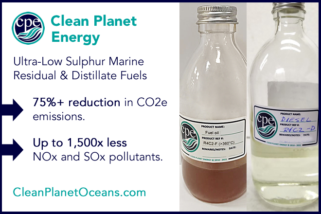 Clean Planet Energy has today released details of two new ultra-clean fuels manufactured to replace fossil fuels in the Marine industry, for use in any ship or vessel. The products branded under the banner of “Clean Planet Oceans” can provide CO2e reductions of over 75 percent, and significantly reduce harmful air-pollutants by up to 1,500x. Both fuels are produced using non-recyclable waste plastics as the feedstock, therefore removing waste which would otherwise go to incineration, landfill or into our oceans.