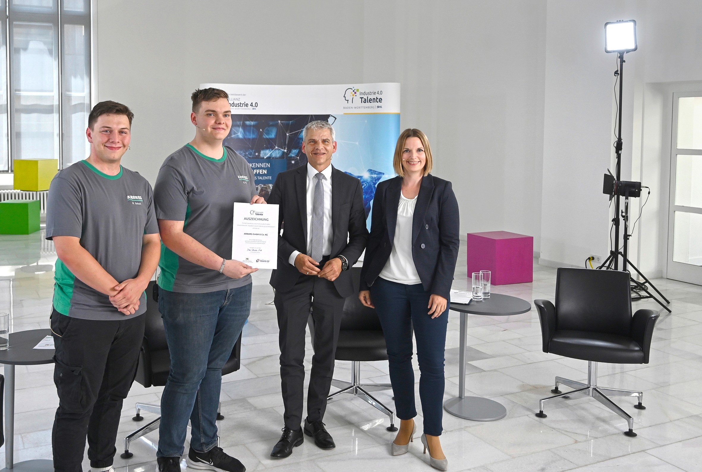 Now it is official: with its trainee project "Smart Bratwurst", Arburg was one of the five winners of the "Industry 4.0 Talents" competition this year. The award was presented to the trainees Nico Schoch and Nils Frey by Dr Patrick Rapp, State Secretary in the Ministry of Economics, Labour and Tourism of the State of Baden-Württemberg, at a virtual awards ceremony. The two trainees travelled to Stuttgart on behalf of the Arburg team to receive the award and present the project in the Haus der Wirtschaft.